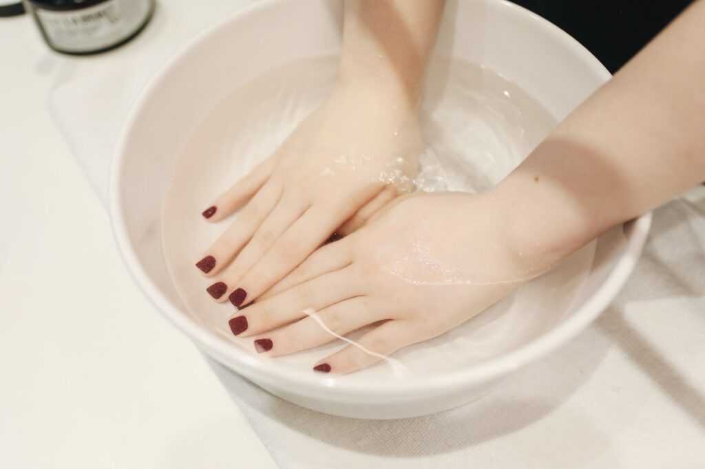 С этой ванночкой нужно быть осторожнее – она сильно сушит кожу рук. Помести в раствор только кончики пальцев, после процедуры сполосни руки проточной водой и обязательно нанеси питательный крем.