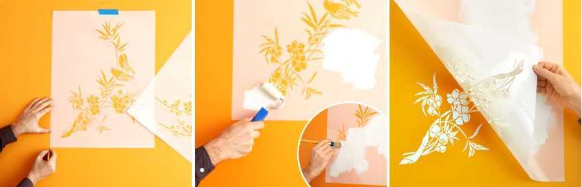 Сразу убирать заготовку нельзя — надо дать декору полностью высохнуть. Затем трафарет снимают со стены, остатки скотча или клея убирают. С заготовки удаляют краску, если предполагается, что трафарет будет применяться неоднократно (например, для повторяющихся рисунков).