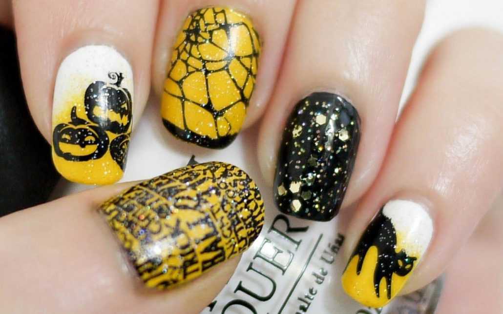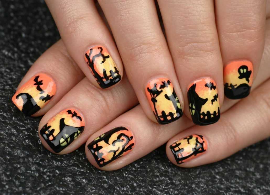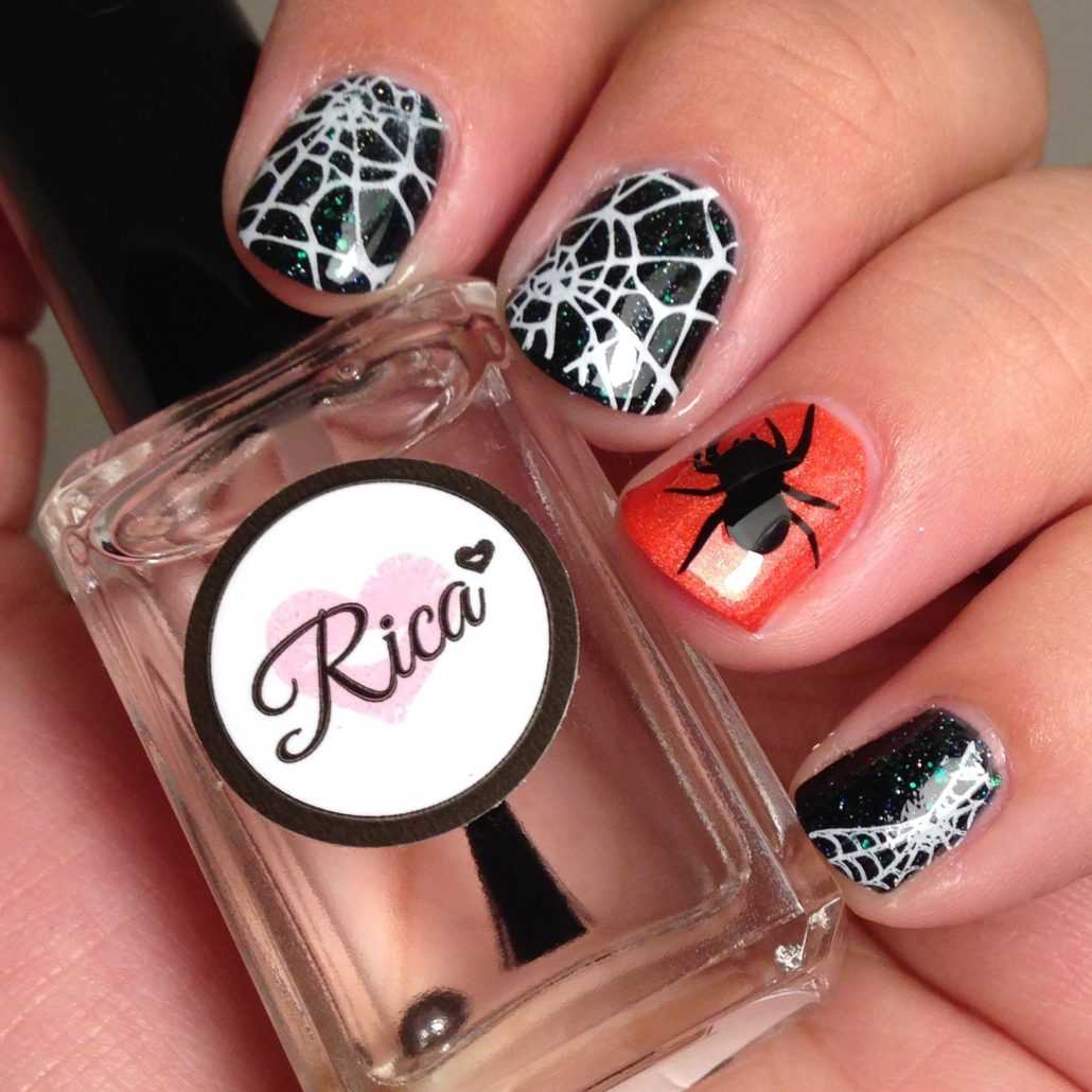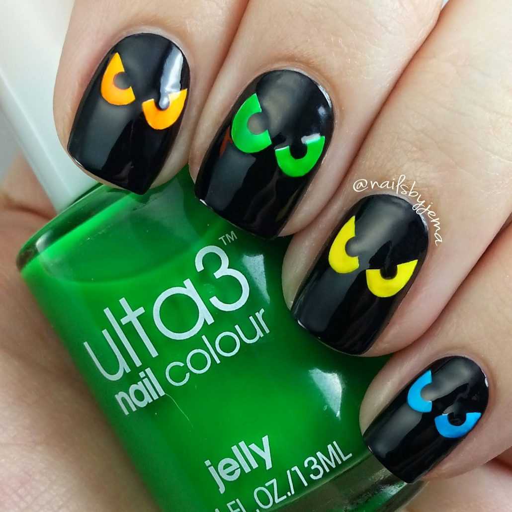 Короткие ноготки черного цвета хорошо впишутся в образ зомби или любого привидения. Если у вас в планах создание образа эффектной, гламурной ведьмочки, то черный маникюр можно дополнить стразами, блестками и другим декором.