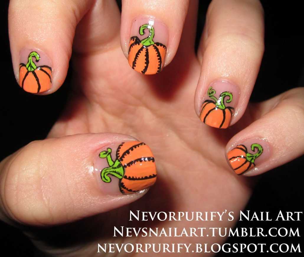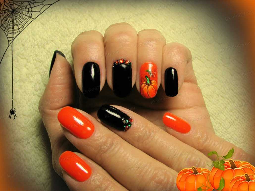 Символом праздника является тыква. Так почему бы не использовать ее рисунки при создании маникюра для Хэллоуина? Несмотря на то, что издалека их изображение может наводить ужас, вблизи оно, как правило, вызывают смех. Изобразить овощ на ногтях можно разными способами.