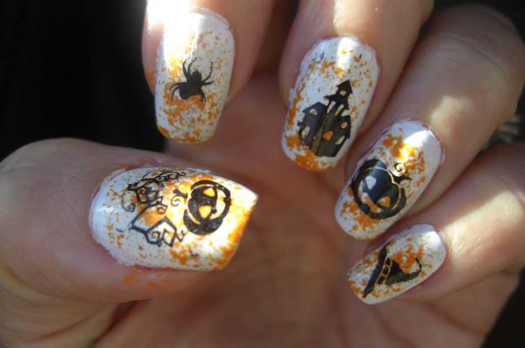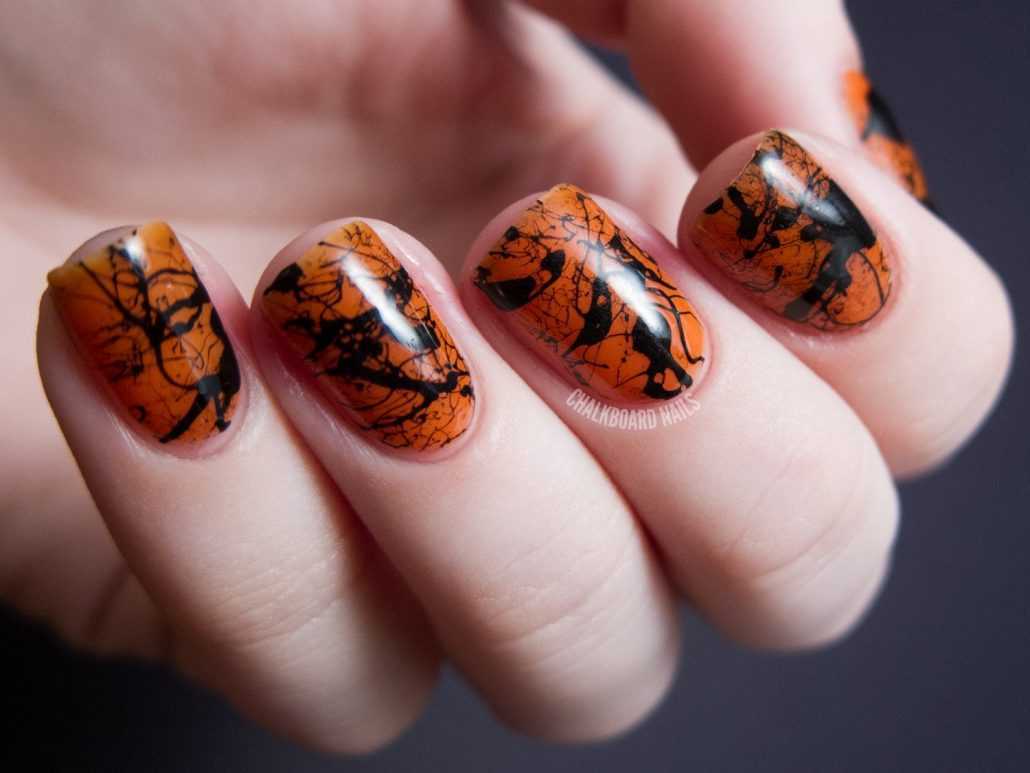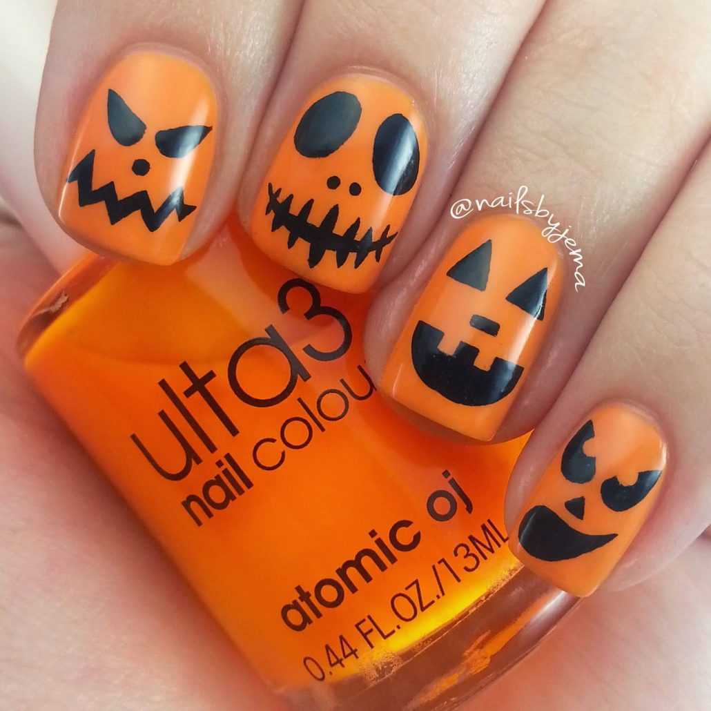 - Тем же черным лаком на оранжевой основе вырисовываются ужасающие рожицы с носом, глазами и страшной улыбочкой. Не страшно, если они получатся неровными.